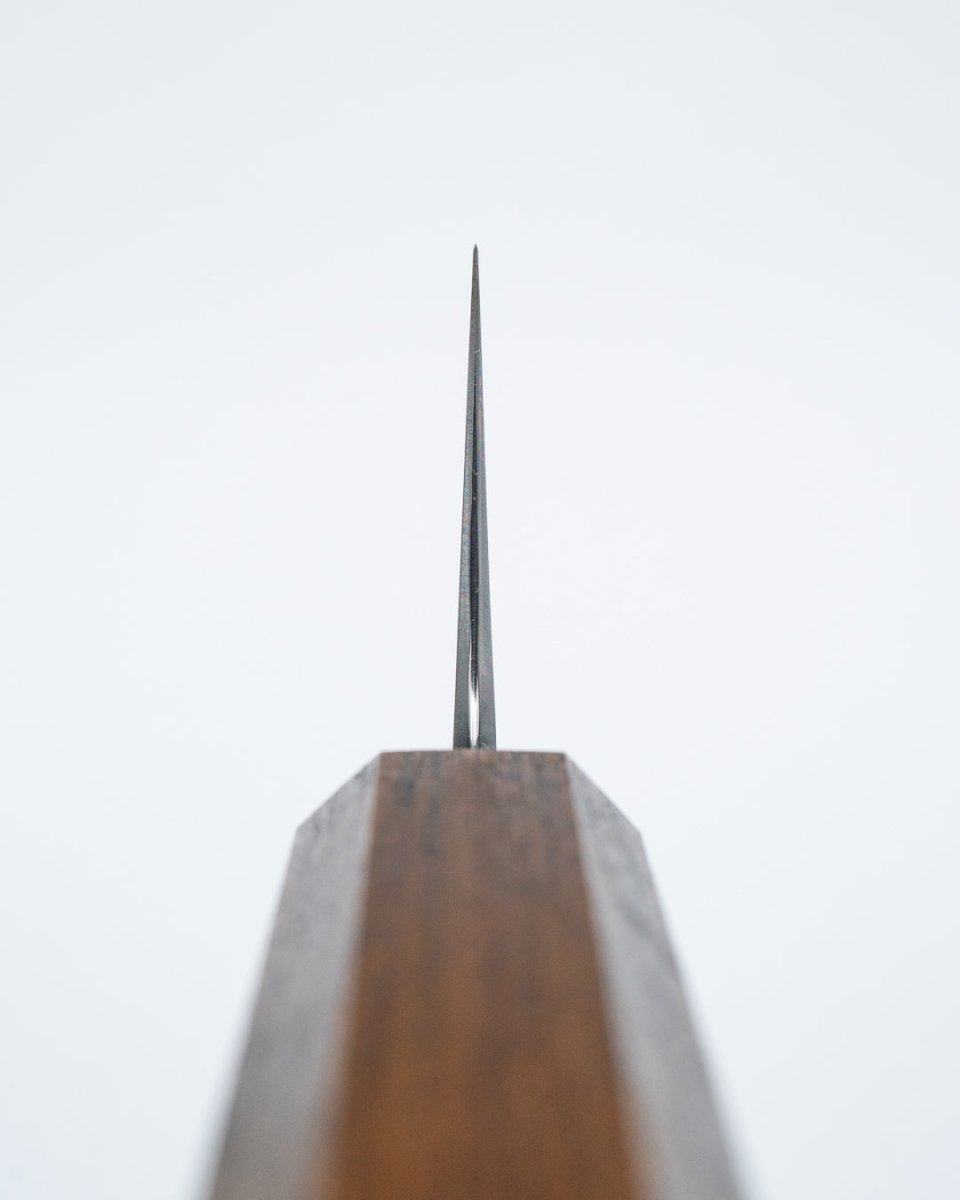 Hado Sumi Black Oak White2 Ko-Bunka 135mm er en kompakt og presis kjøkkenkniv smidd i Shirogami #2 karbonstål av mestersmed Yoshikazu Tanaka. Den har en tradisjonell kurouchi-finish og et åttekantet håndtak i sortlakkert eik, ideell for detaljarbeid og mindre kutteoppgaver.