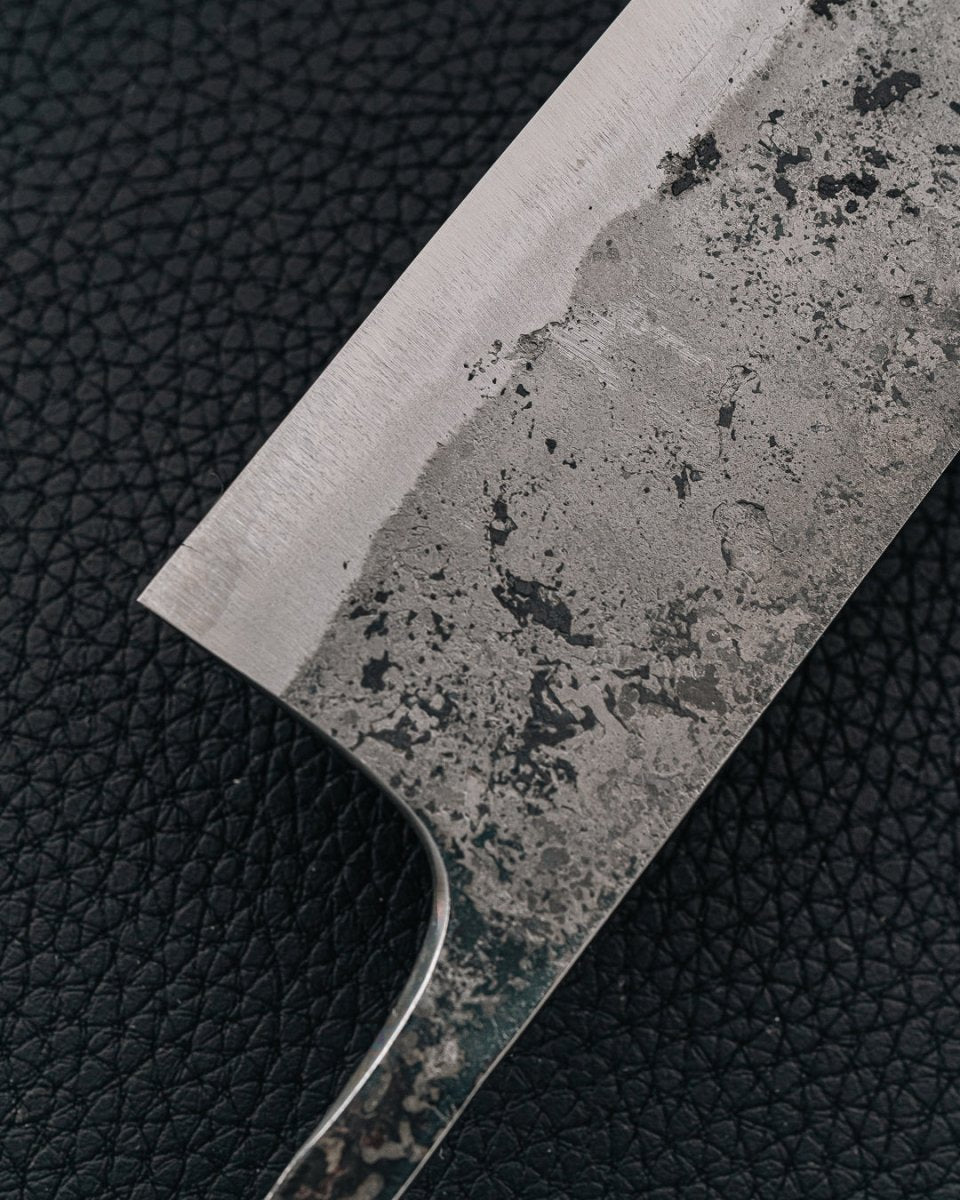 Tilbyr en balanse mellom skarphet, holdbarhet og slipevennlighet. Allsidig og populær blant profesjonelle kokker. Rengjør og tørk umiddelbart etter bruk; unngå langvarig eksponering for fuktighet. Utvikler en beskyttende patina over tid som reduserer risikoen for rust og gir bladet et unikt preg.