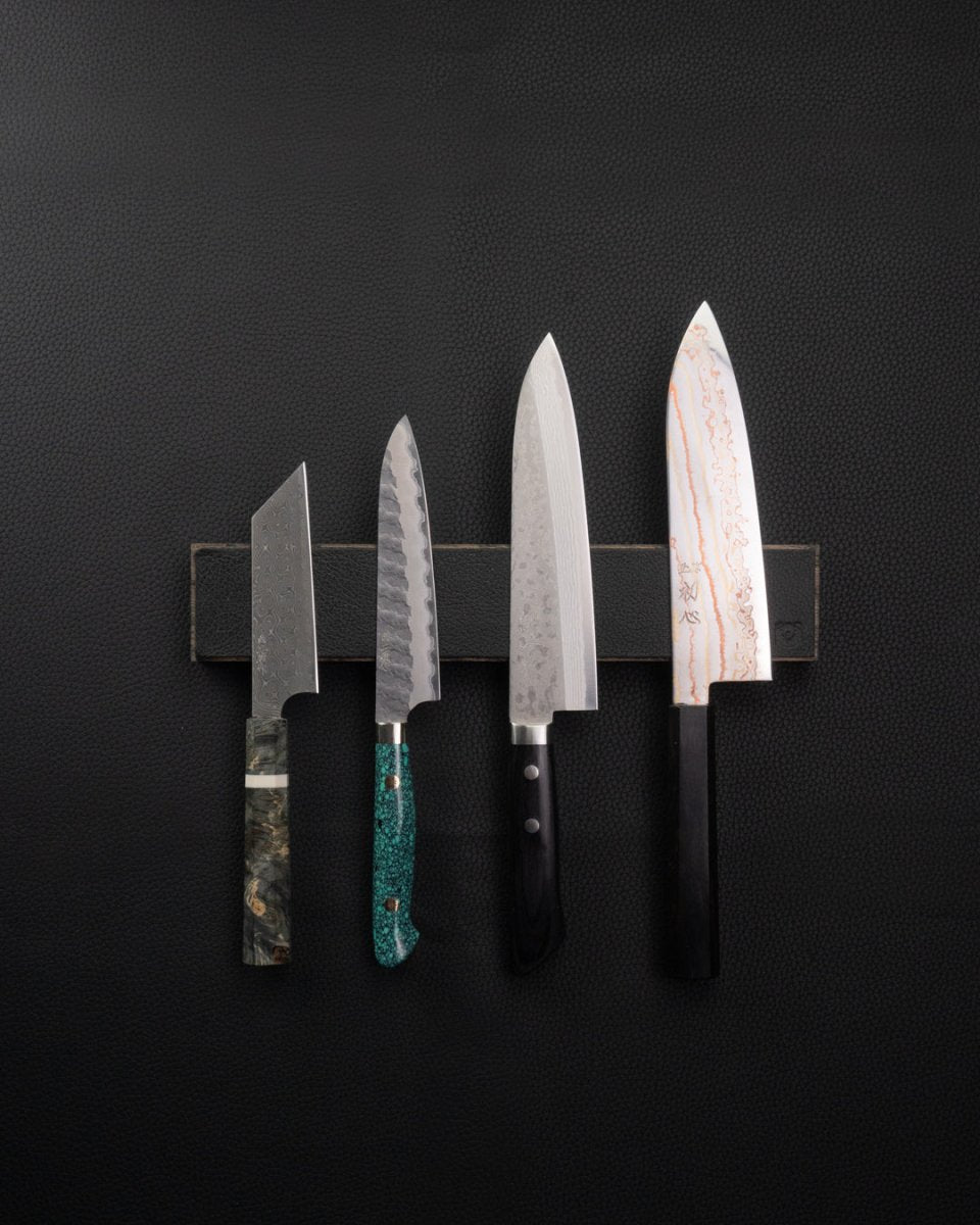 Piotr The Bear sin magnetiske knivlist i massivt røkt eik og sort skinn er håndlaget av høyeste kvalitet, og vil ta godt vare på knivene dine på kjøkkenet.