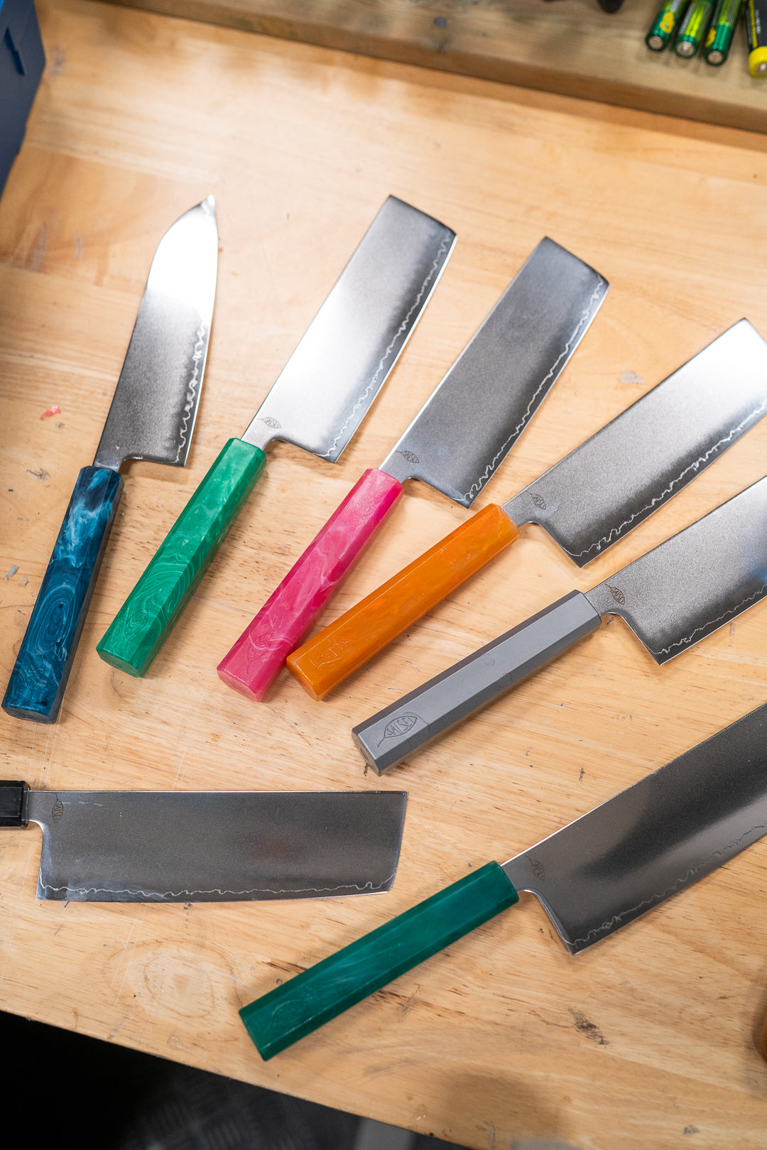 Håndtaket er laget av norsk gjenbruksplast fra mat- og næringsmiddelindustrien. Plasten gir et mykt og levende fargespill, med naturlige variasjoner som gjør hver kniv unik.