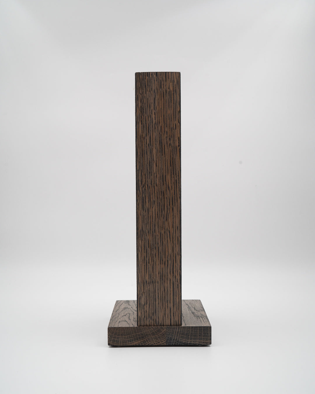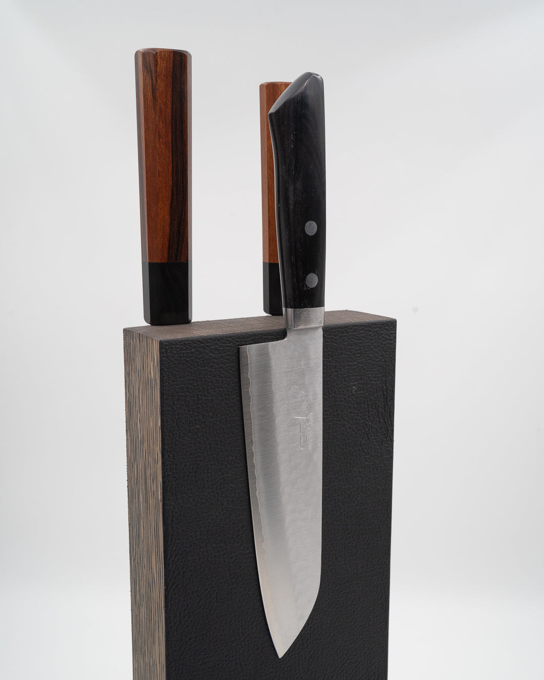 Solid knivblokk i heltre eik laget av Piotr the Bear. Sterke magneter med ekte sort lær som tar vare på knivene dine samtidig som de viser de frem på en pen måte.