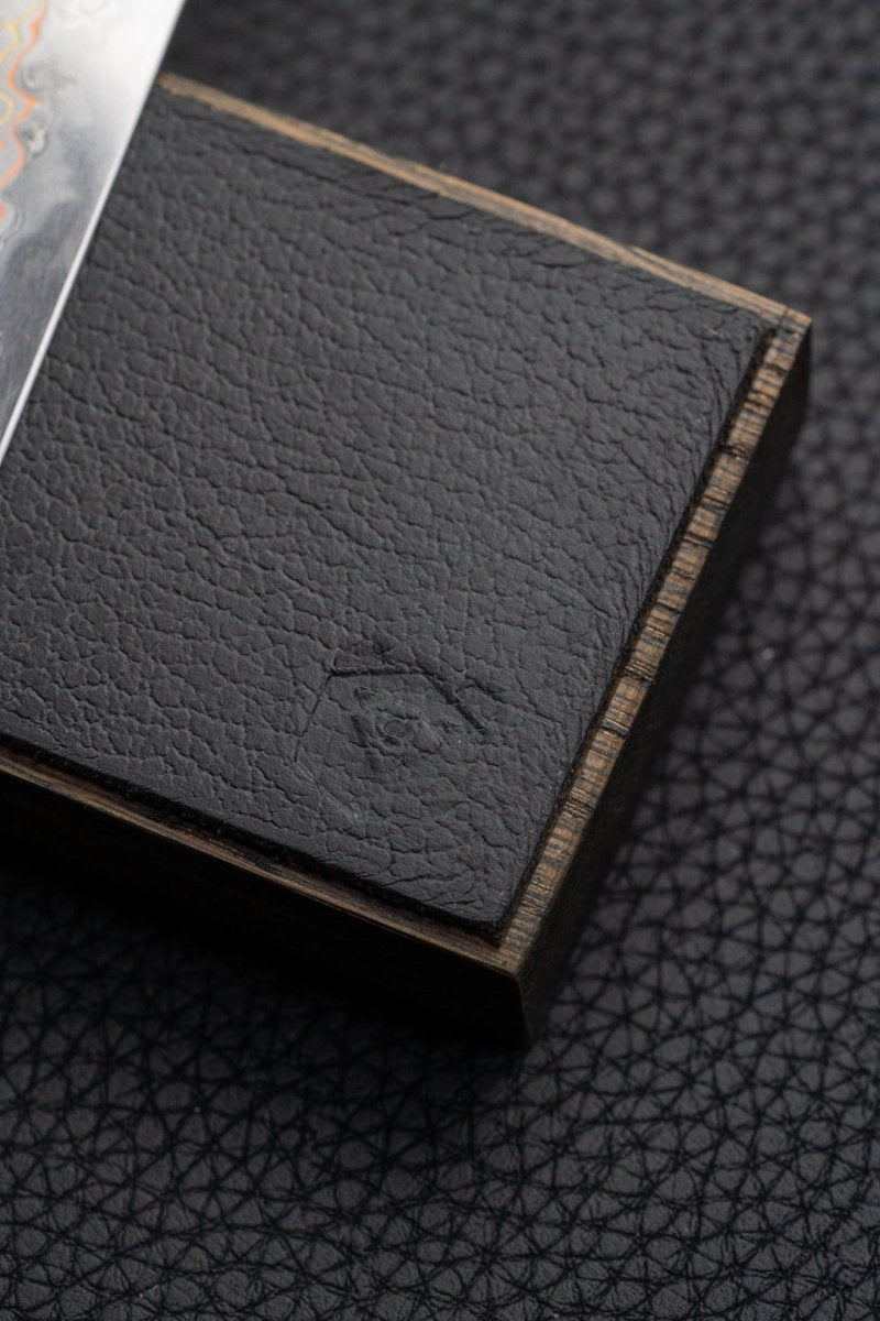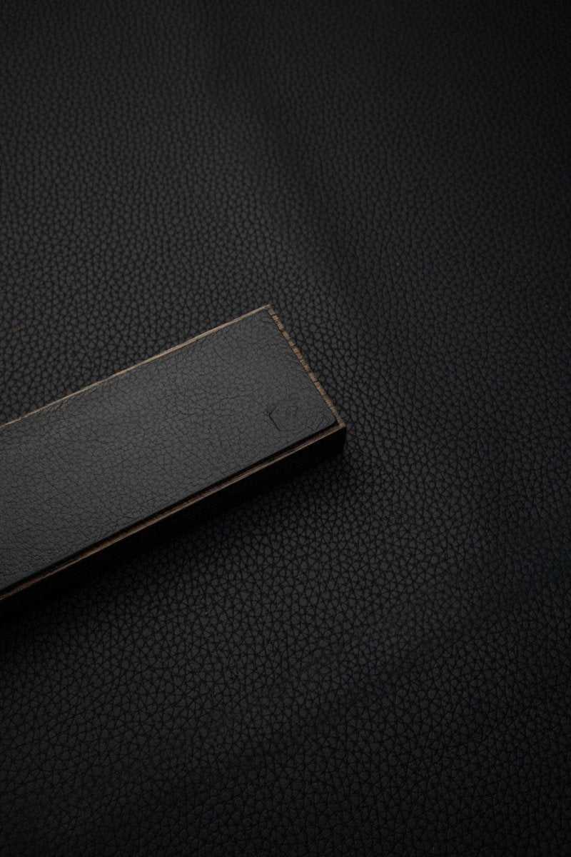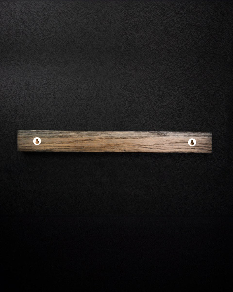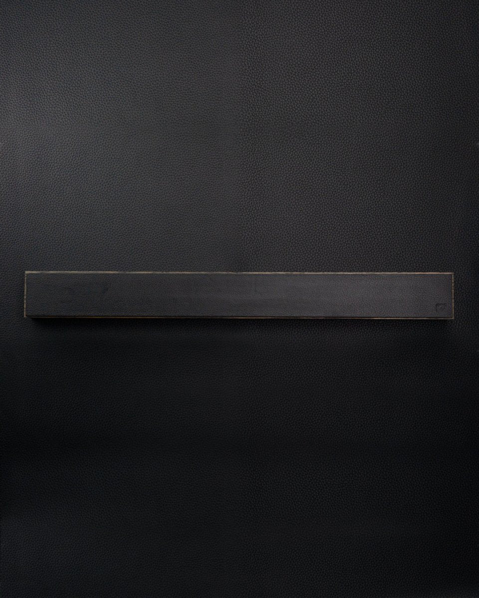 Piotr The Bear 's magnetic knife edge in solid smoked oak and black leather is handmade of the highest quality, and will take good care of your knives in the kitchen.