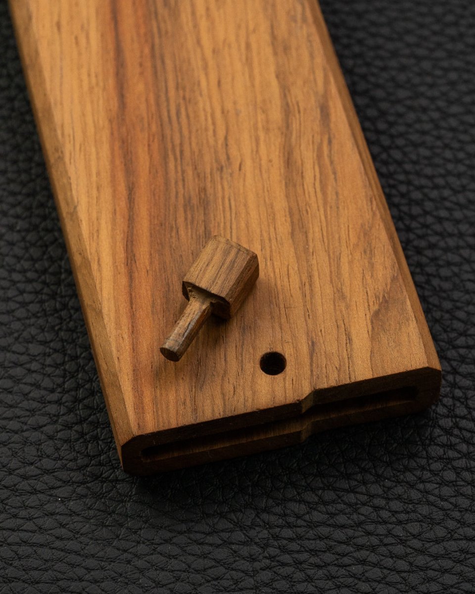 En god venn av oss, Einar Indergård har laget en saya - en tradisjonell japansk treslire til kniven. Sliren i massiv teak er nøye laget for hånd og polert med voks for å danne et beskyttende lag mot fukt, og står i stil med treskaftet som forøvrig er i teak og bøffelhorn.