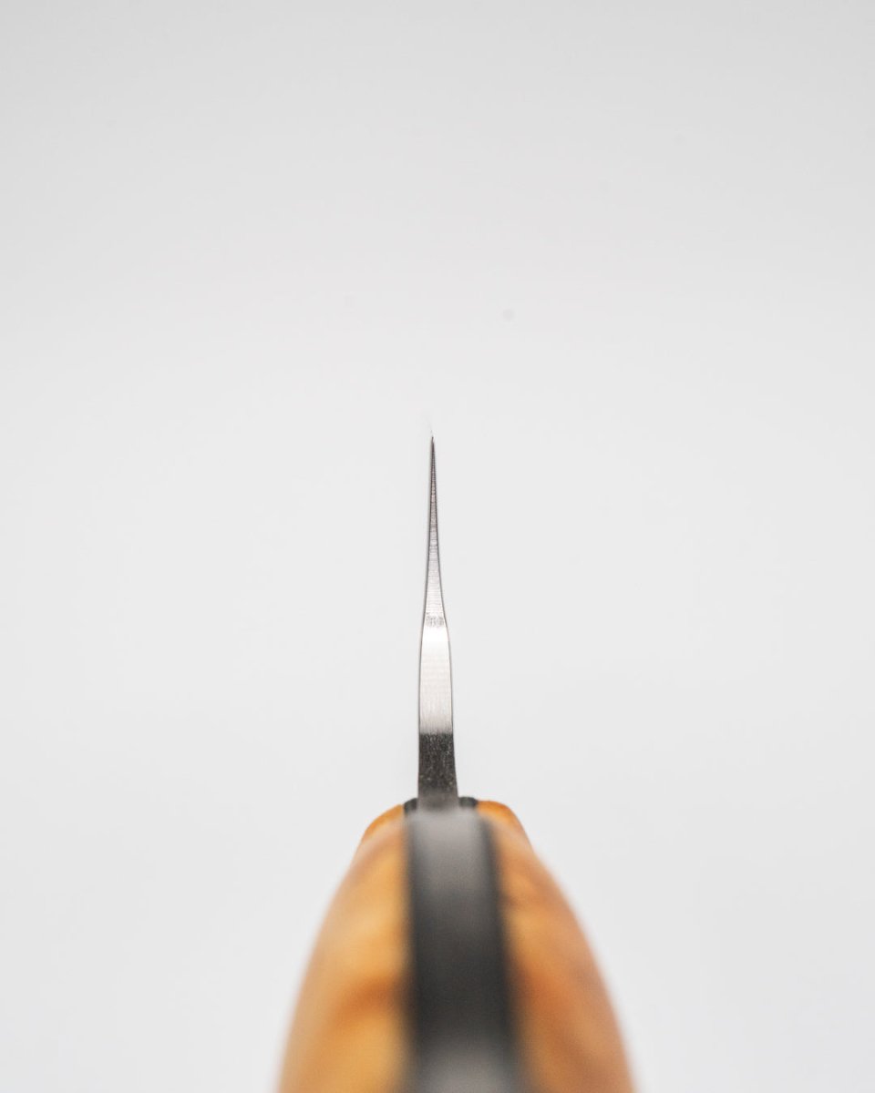 Håndtaket i masurbjørk med vulkanfiber-innlegg gir et varmt og naturlig grep, samtidig som treets unike mønster gjør hver kniv helt spesiell. Kniven kombinerer japansk funksjonalitet med Helles lange erfaring innen norsk knivproduksjon – et verktøy designet for både hverdagskokker og entusiaster som verdsetter kvalitet.