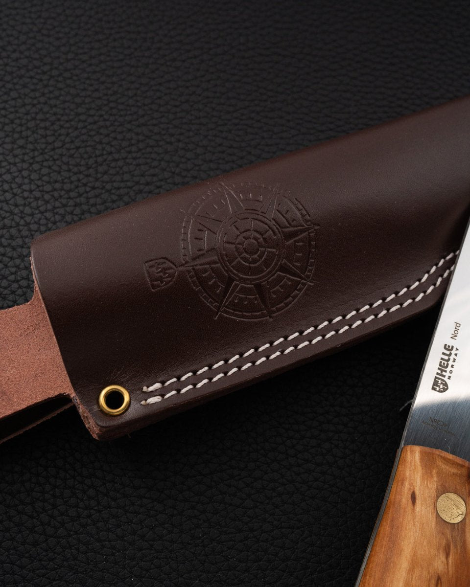 Håndtaket er laget i masurbjørk, et naturlig vakkert og slitesterkt treslag med unike mønstre i veden. Hver kniv får derfor sitt helt eget uttrykk, og treverket gir et varmt og sikkert grep – uansett vær og bruk. Kniven leveres med en solid lærslire som beskytter både bladet og brukeren, og gjør den enkel å bære i felt.
