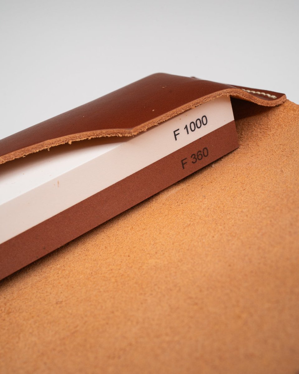 Slipesteinen leveres med et solid skinnetui som beskytter under transport og fungerer som stabilt underlag når du sliper. Etuiet kan også brukes som stropp for å polere eggen, eller til å oppbevare småting du alltid vil ha med deg på tur.