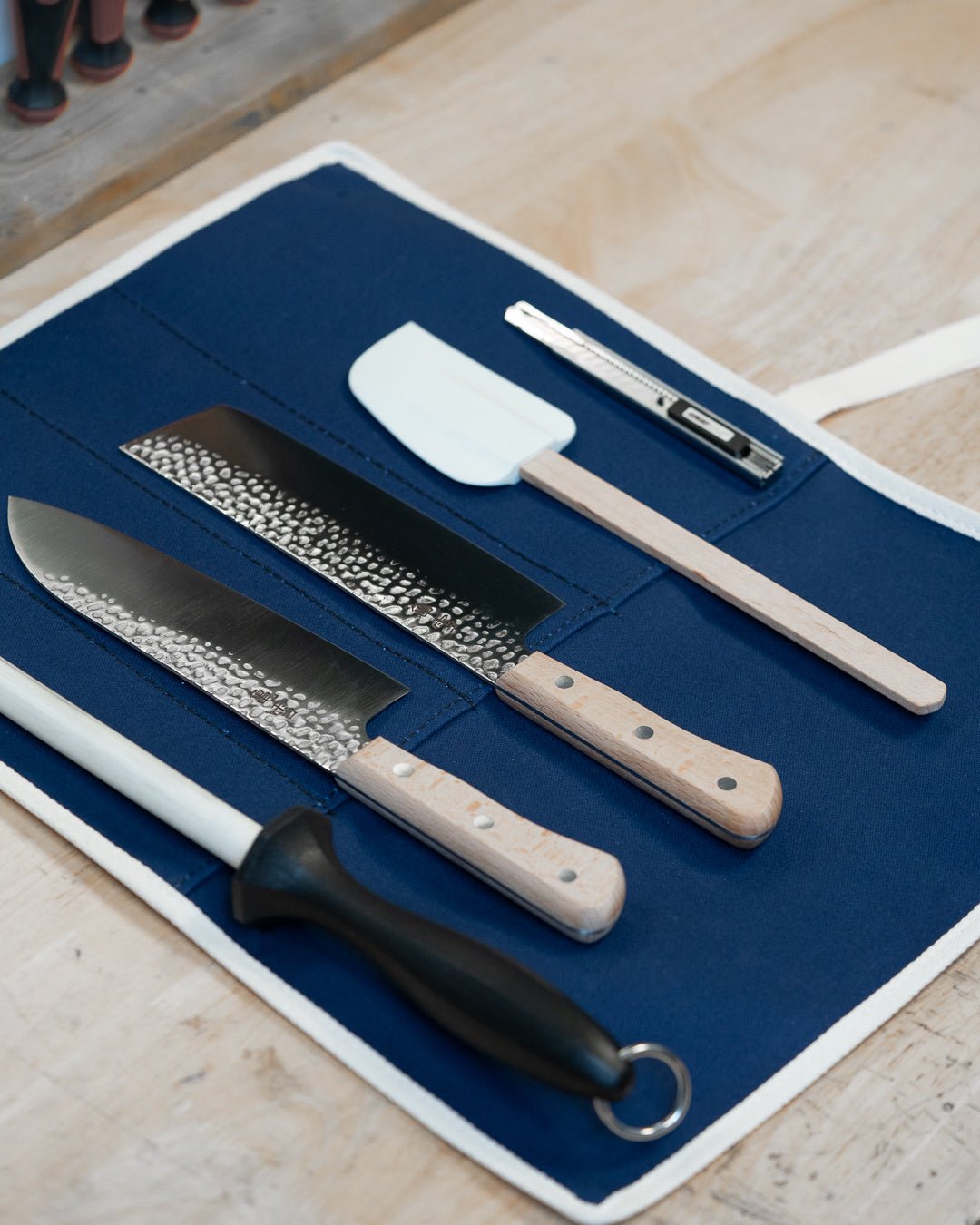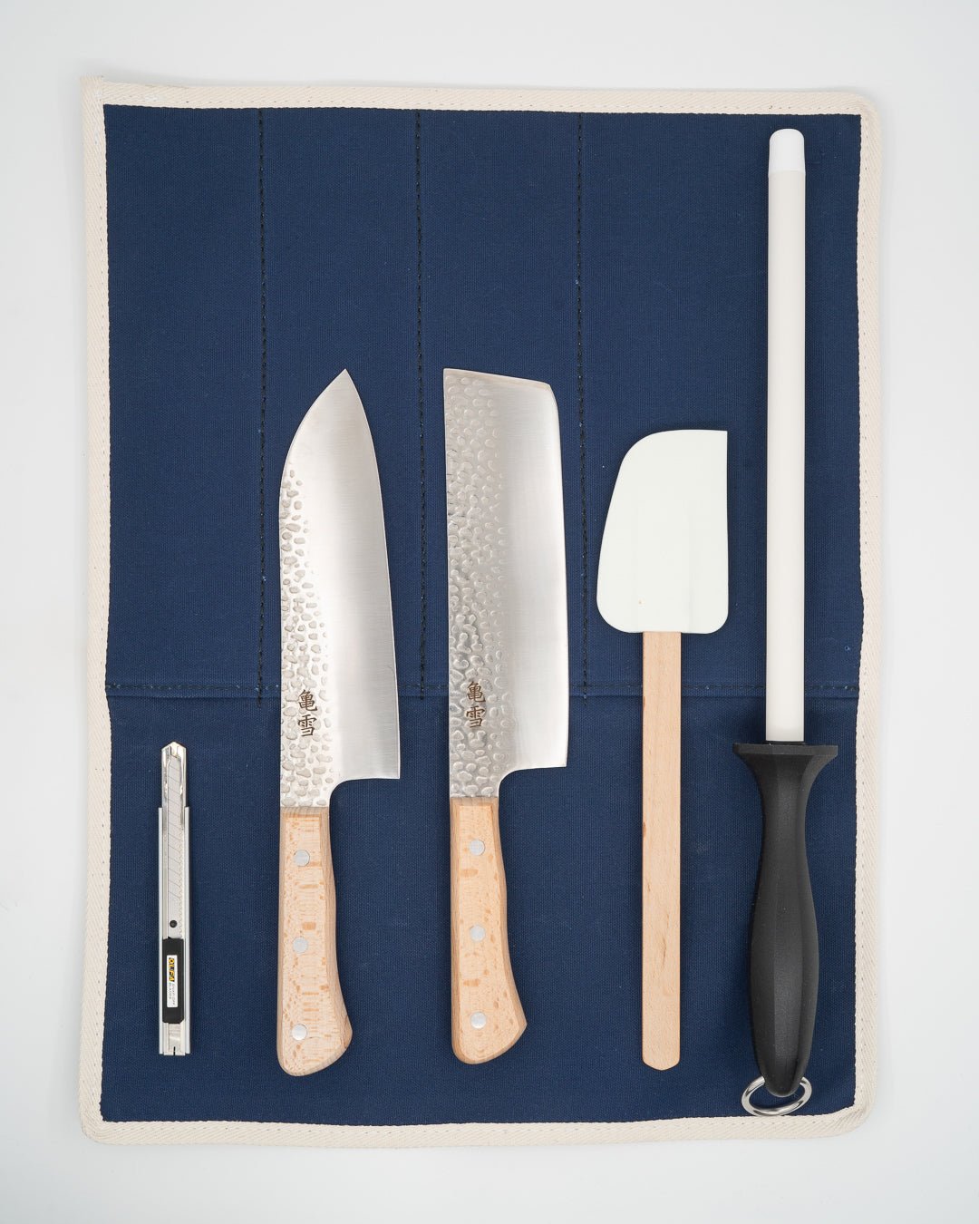 Vi har samlet en rekke med kvalitetsprodukter som man trenger på kjøkkenet enten man er lærling, student, eller interessert i å utforske matlaging med bedre verktøy. I denne pakken finner du to ulike japanske kniver - en santoku kokkekniv og en nakiri grønnsakskniv, en keramisk skjerpestav for å vedlikeholde knivene, en slikkepott av silikon, og OLFA brytebladkniv, alle verktøyene oppbevares praktisk i en stilig og funksjonell knivrull laget av bomull, perfekt for både oppbevaring og transport.